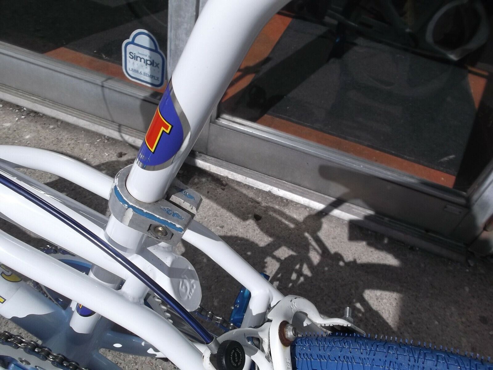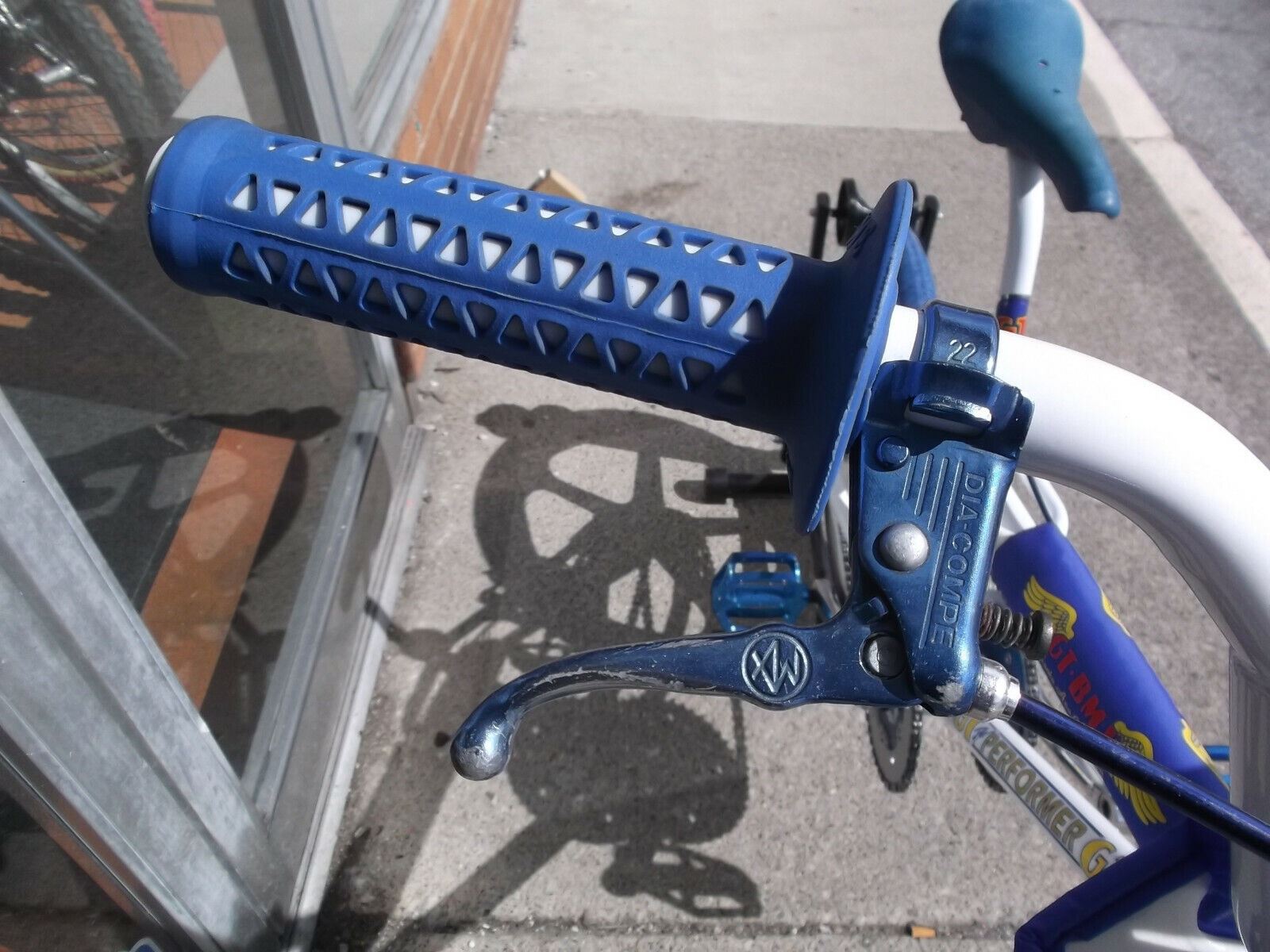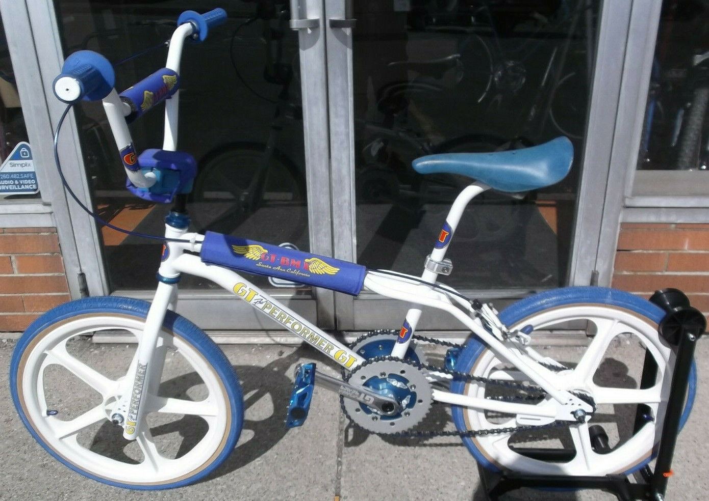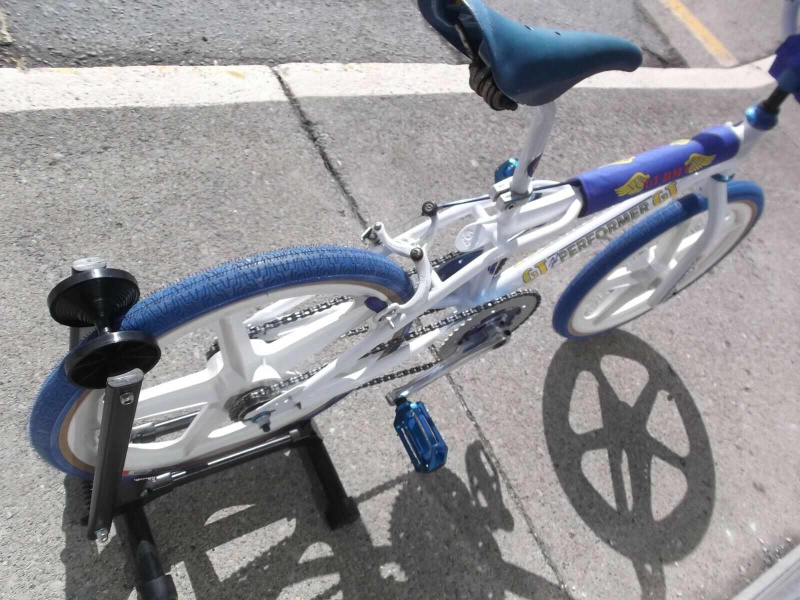 the frame, fork, handlebars, and seat post have been blasted to the bare metal and powder coated white, all new decals applied. New GT Power Series Cranks and bottom bracket, og Mallet stem with og finish, New Ame Unitron grips, 80's tech 3 dc brake lever, 80's dc 901 brake caliper, modified New Skyway tuff 2 wheels, New Neptune power disc with GT Wing decals, New Panaracer decals, New Neco sealed bearing head set, New Haro Pedals, 80's Kashimax Aero Seat.