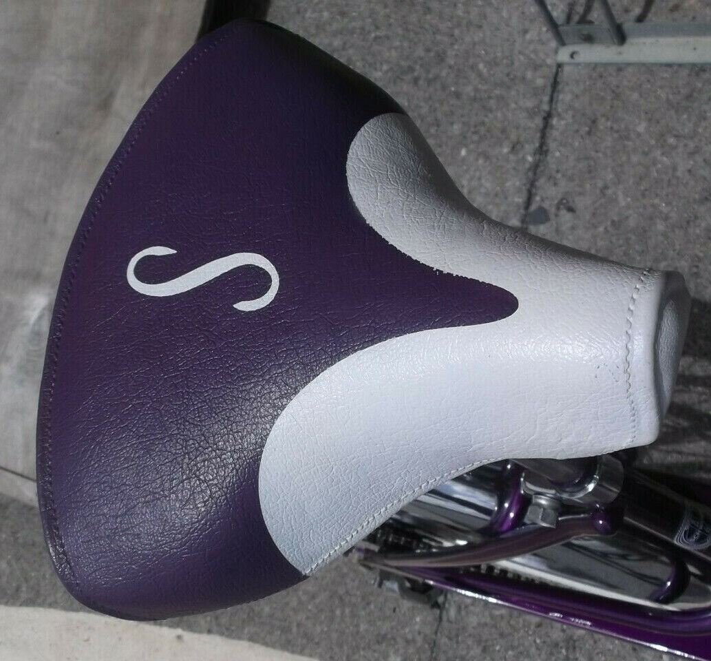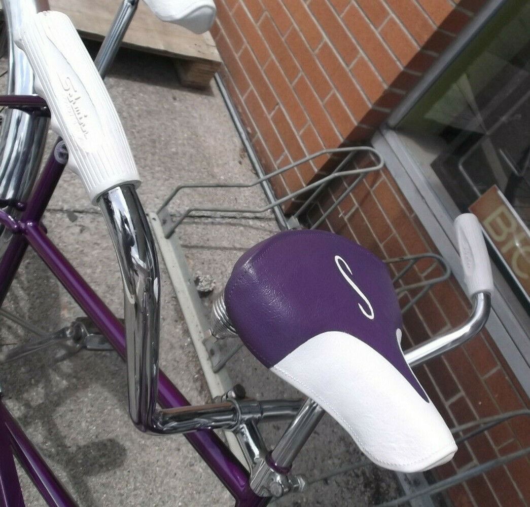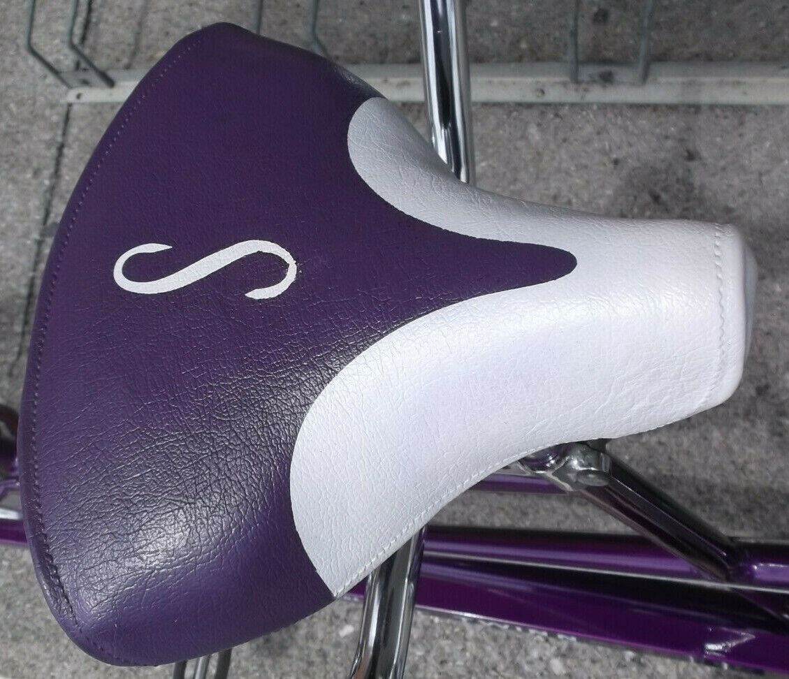 for your consideration, is this 1965 Schwinn Tandem Deluxe. it has been sandblasted to the bare metal and powder coated violet, the seats were custom painted to match, all chrome has been polished (some pitting as pictured)and all the bearings have been re-greased....new items are: chains, cables, and tires ....s7 wheels atom rear brake with 5 speed, NOS kickstand...This looks even better in person! ride in or put it in your man-cave